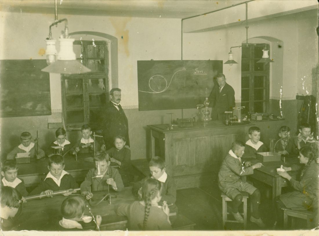 Szk powszechna międzywojnie lekcja fizyki od lewej kier szkoły Franciszek Krzyżogórski nauczyciel Ignacy Nader
