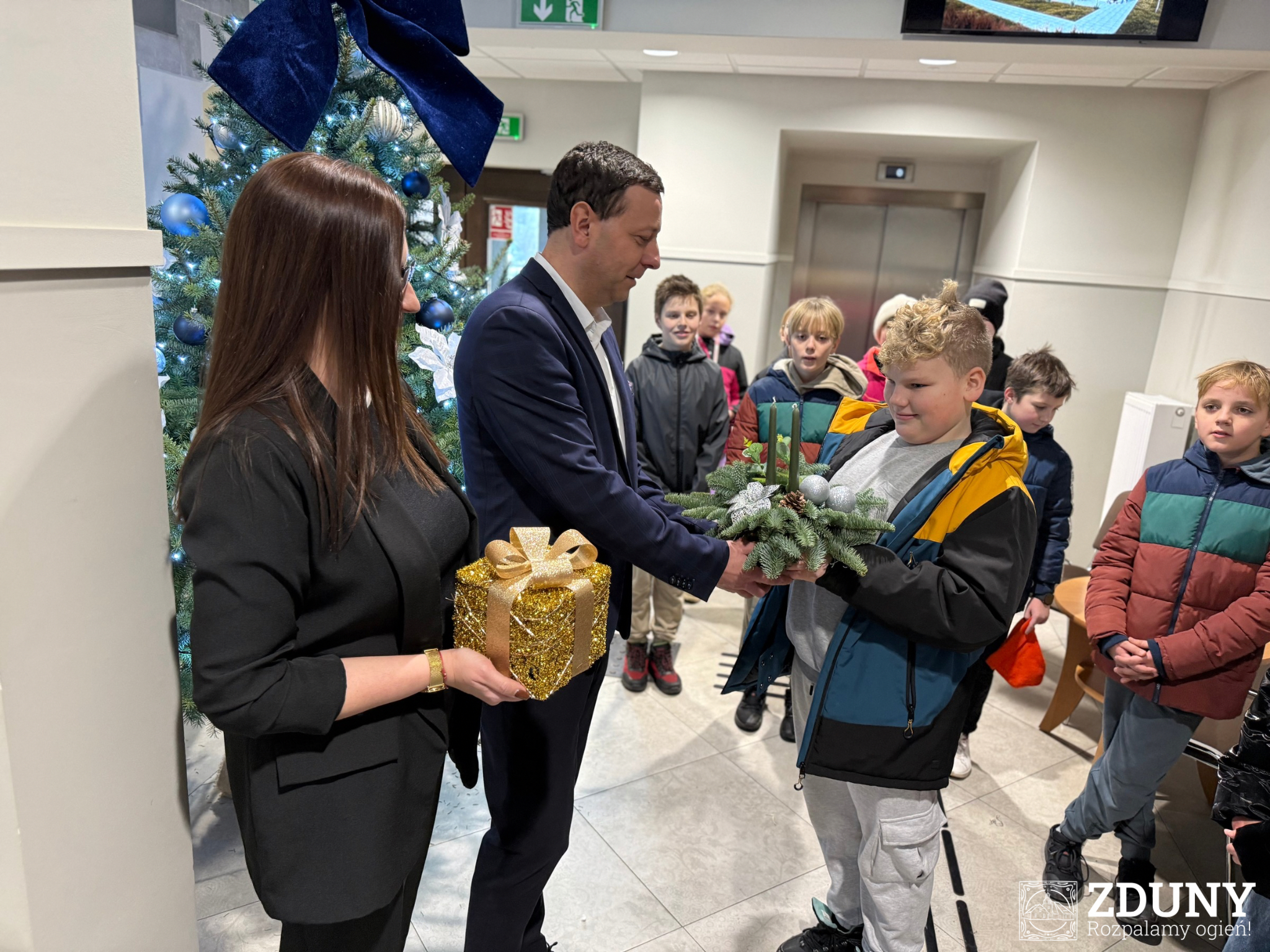 Dzieci przybyły z serdecznymi życzeniami świątecznymi, własnoręcznie wykonanymi kartkami oraz pięknymi ozdobami i stroikami. Gości powitali Burmistrz Zdun Miłosz Zwierzyk oraz Zastępca Burmistrza Anna Pietrzak-Figlak, składając im również świąteczne życzenia oraz częstując słodkościami.