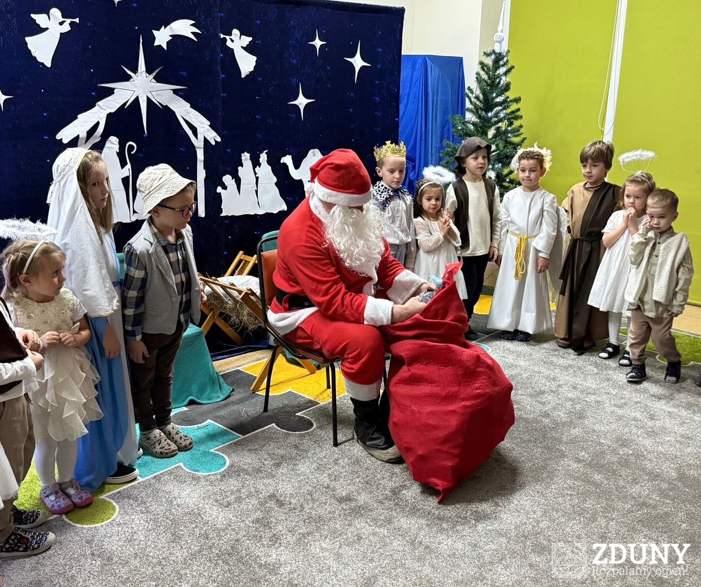 Nastrój podkreślały niecodzienne stroje dzieci oraz bożonarodzeniowa dekoracja sali. Miłą niespodzianką była wizyta Świętego Mikołaja, który nagrodził wszystkie dzieci słodkimi upominkami.