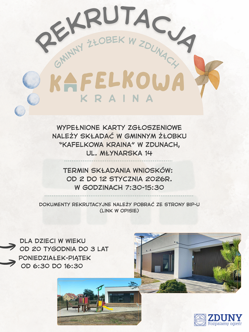 w dniach od 2-12 stycznia 2026 roku odbędzie się rekrutacja do Gminnego Żłobka w Zdunach „Kafelkowa Kraina”. Wniosek o przyjęcie do żłobka wraz z wymaganymi załącznikami należy składać w formie papierowej w sekretariacie żłobka.