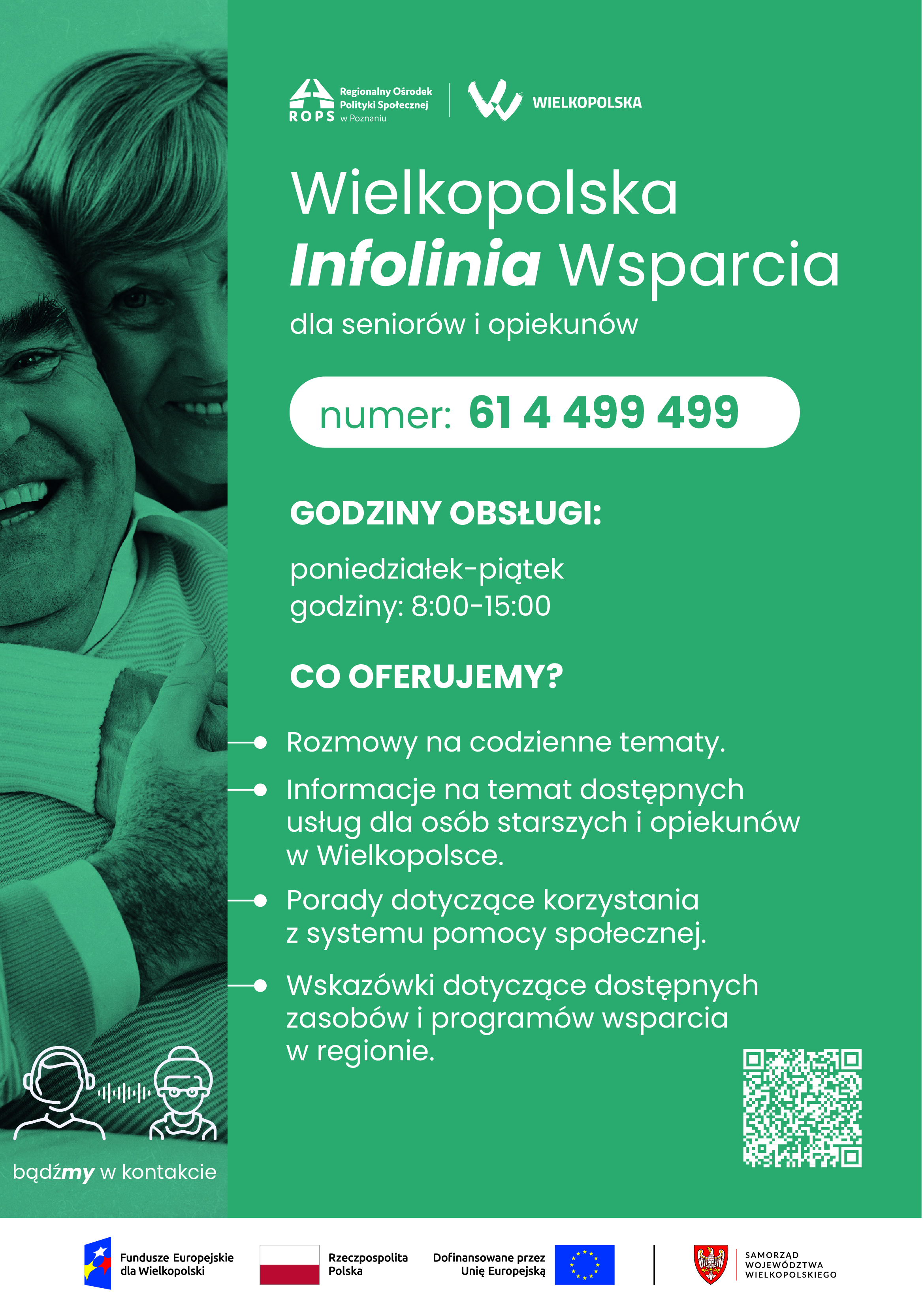 Wielkopolska Infolinia Wsparcia jest częścią projektu „Wielkopolskie Telecentrum Opieki” dofinansowanego przez Unię Europejską w ramach Programu „Fundusze Europejskie dla Wielkopolski 2021-2027”.