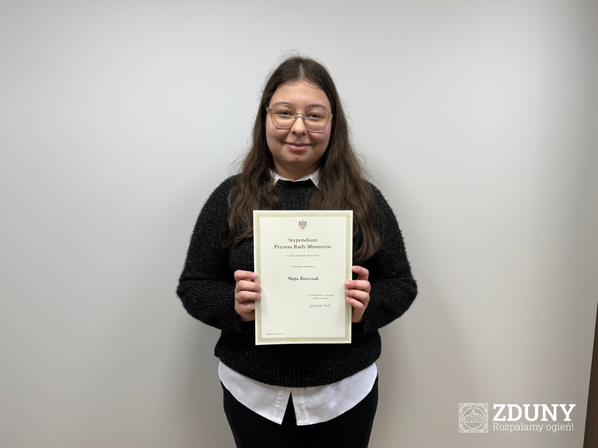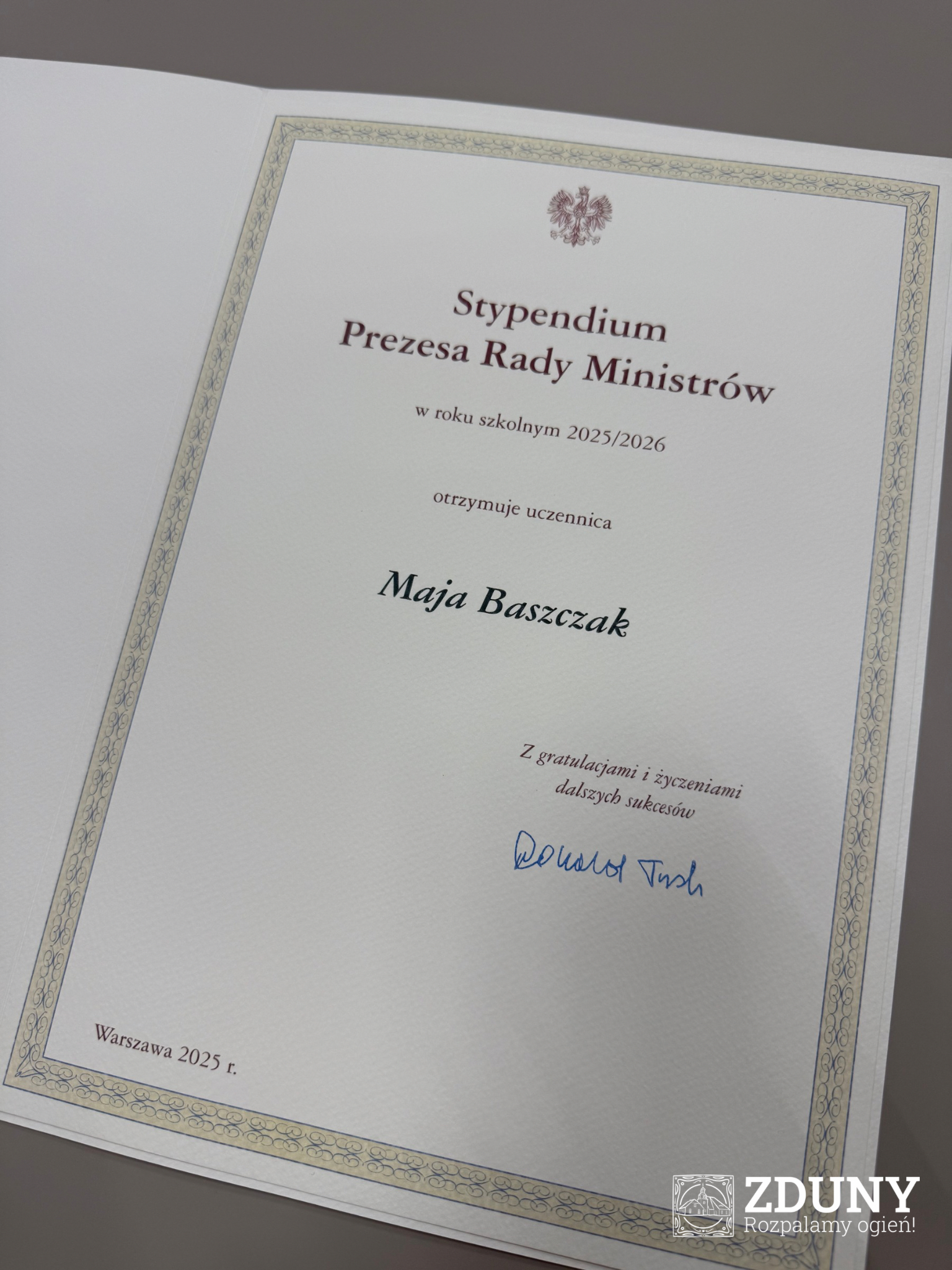 Miło nam poinformować, że w roku szkolnym 2025/2026 Stypendium Prezesa Rady Ministrów za wybitne wyniki w nauce i najwyższą średnią ocen zostało przyznane uczennicy Zespołu Szkół Ponadpodstawowych w Zdunach Mai Baszczak.